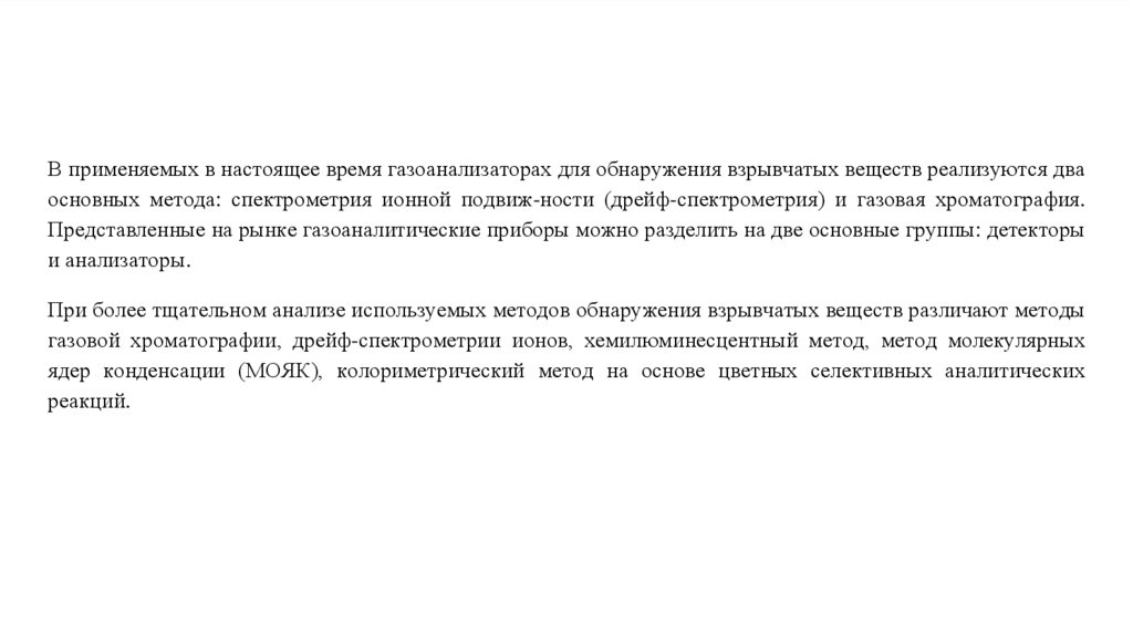 В применяемых в настоящее время газоанализаторах для обнаружения взрывчатых веществ реализуются дваосновных метода: спектрометрия ионной подвиж-ности (дрейф-спектрометрия) и газовая хроматография.