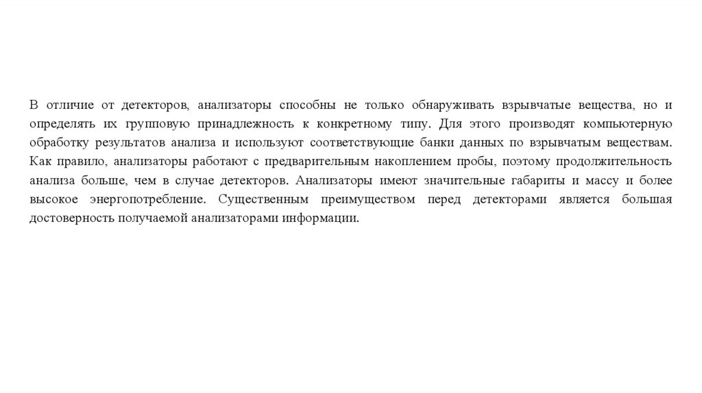 В отличие от детекторов, анализаторы способны не только обнаруживать взрывчатые вещества, но иопределять их групповую принадлежность к конкретному типу. Для этого производят компьютерную