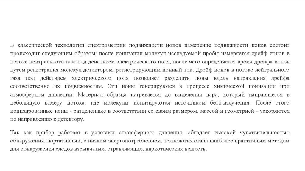 В классической технологии спектрометрии подвижности ионов измерение подвижности ионов состоитпроисходит следующим образом: после ионизации молекул исследуемой пробы измеряется дрейф ионов в
