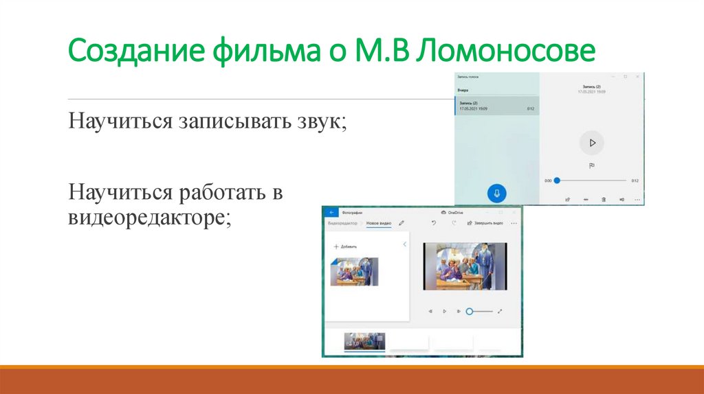 Создание фильма о М.В ЛомоносовеНаучиться записывать звук;