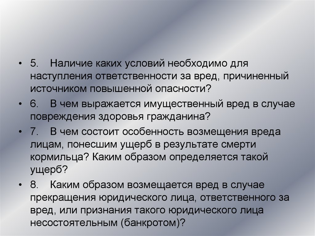 • 5. Наличие каких условий необходимо длянаступления ответственности за вред, причиненный