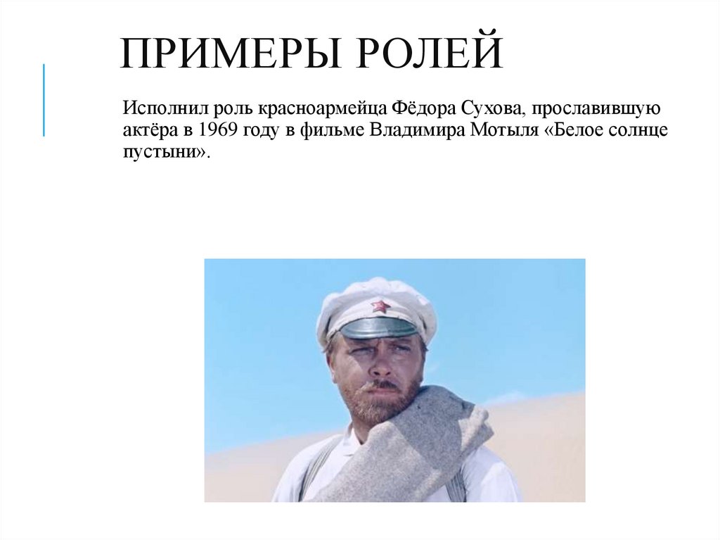ПРИМЕРЫ РОЛЕЙИсполнил роль красноармейца Фёдора Сухова, прославившую