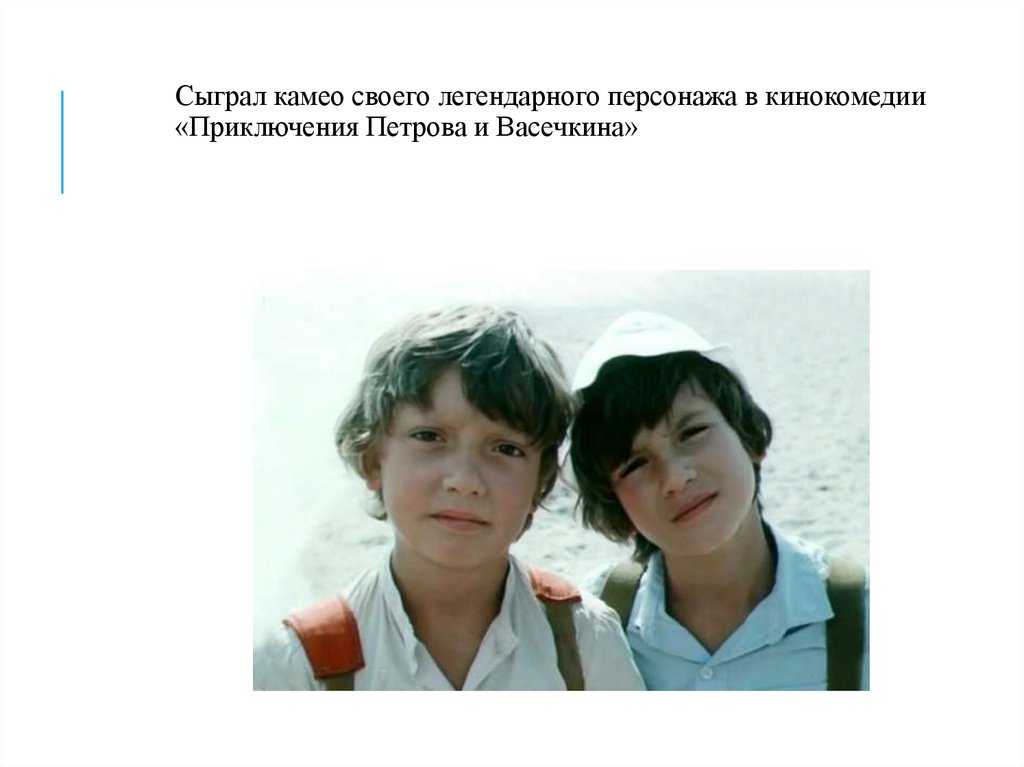 Сыграл камео своего легендарного персонажа в кинокомедии«Приключения Петрова и Васечкина»