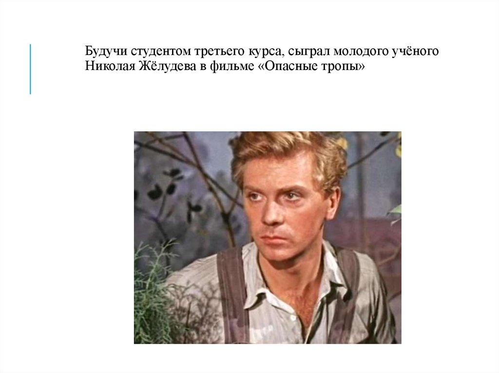Будучи студентом третьего курса, сыграл молодого учёногоНиколая Жёлудева в фильме «Опасные тропы»