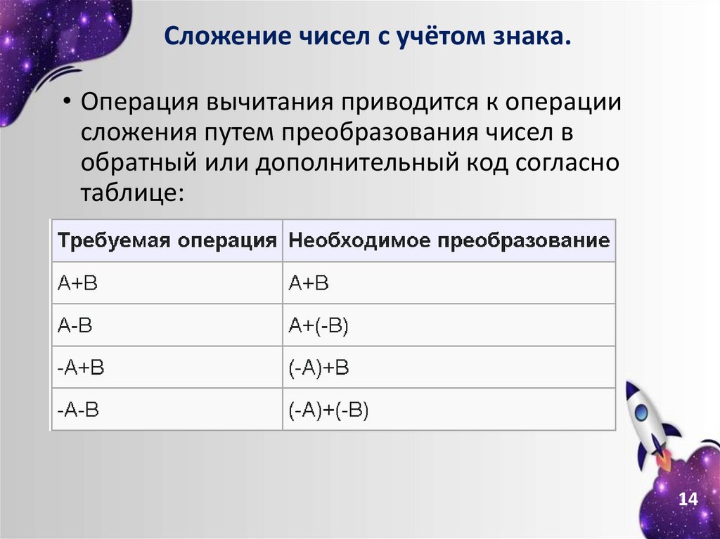 Сложение чисел с учётом знака.• Операция вычитания приводится к операции