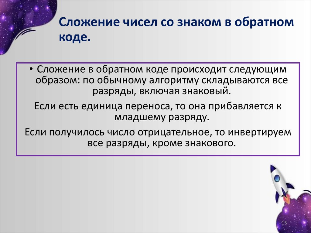 • Сложение в обратном коде происходит следующим