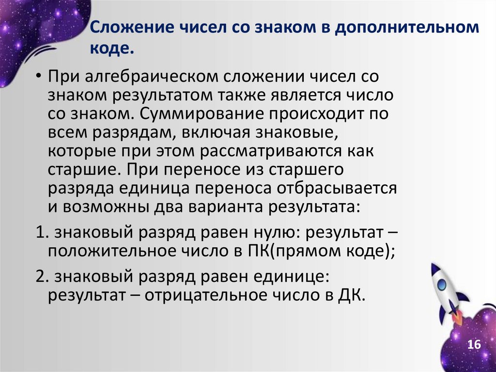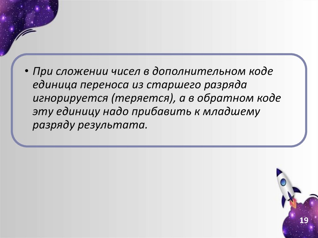 • При сложении чисел в дополнительном кодеединица переноса из старшего разряда
