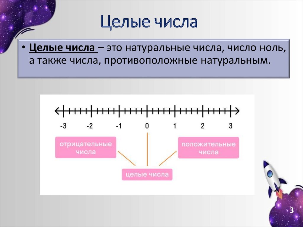 Целые числа• Целые числа – это натуральные числа, число ноль,