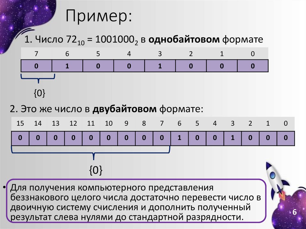 Пример:1. Число 7210 = 10010002 в однобайтовом формате