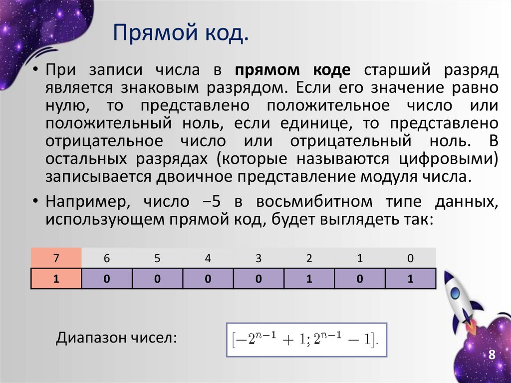 Прямой код.• При записи числа в прямом коде старший разряд