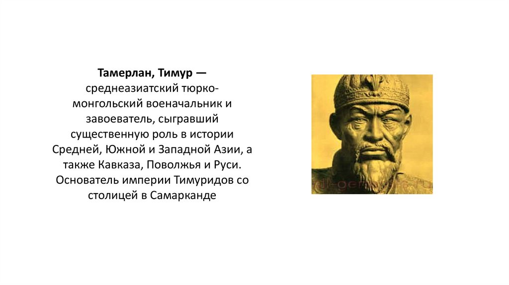 Тамерлан, Тимур —среднеазиатский тюркомонгольский военачальник и