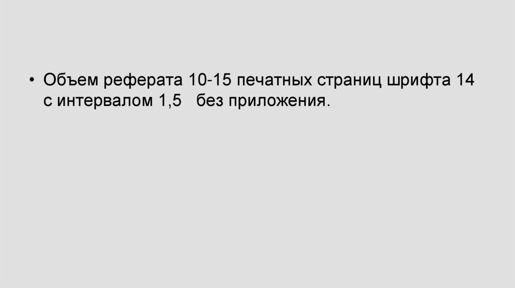 • Объем реферата 10-15 печатных страниц шрифта 14с интервалом 1,5 без приложения.