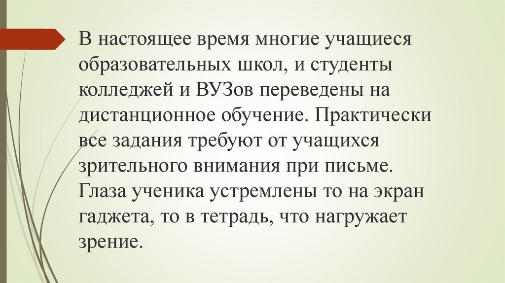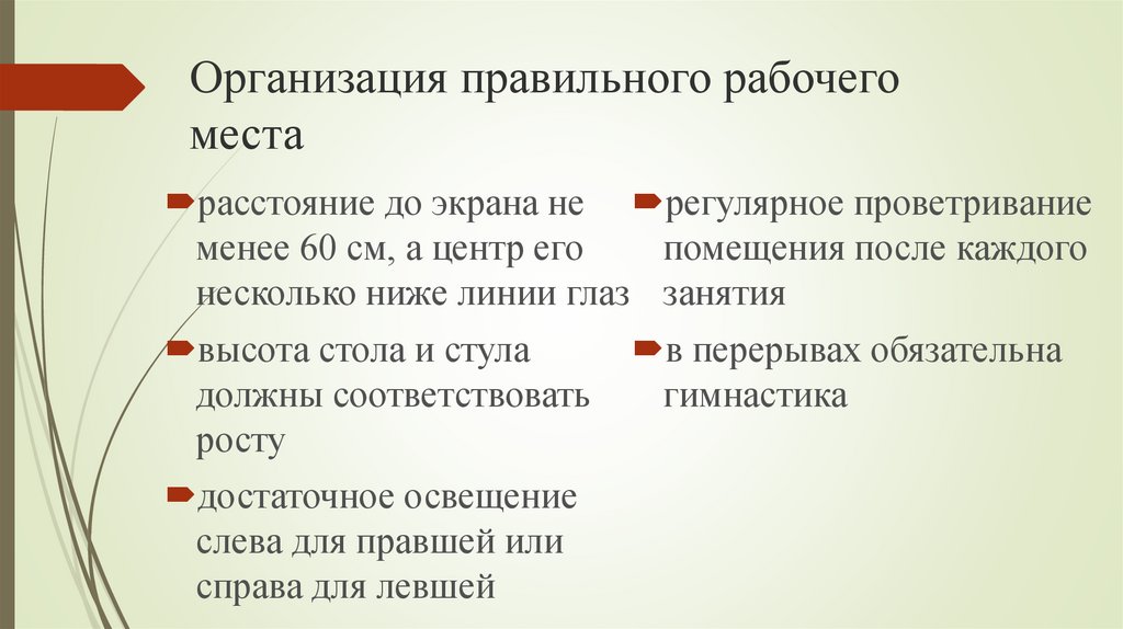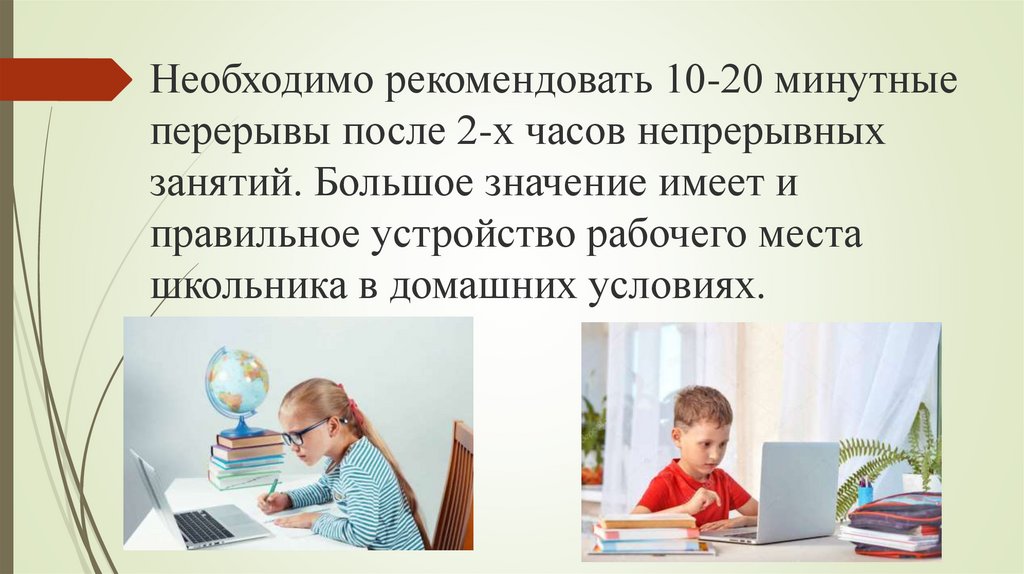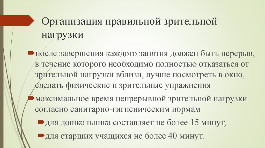 Необходимо рекомендовать 10-20 минутныеперерывы после 2-х часов непрерывных