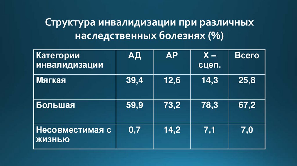 Структура инвалидизации при различныхнаследственных болезнях (%)