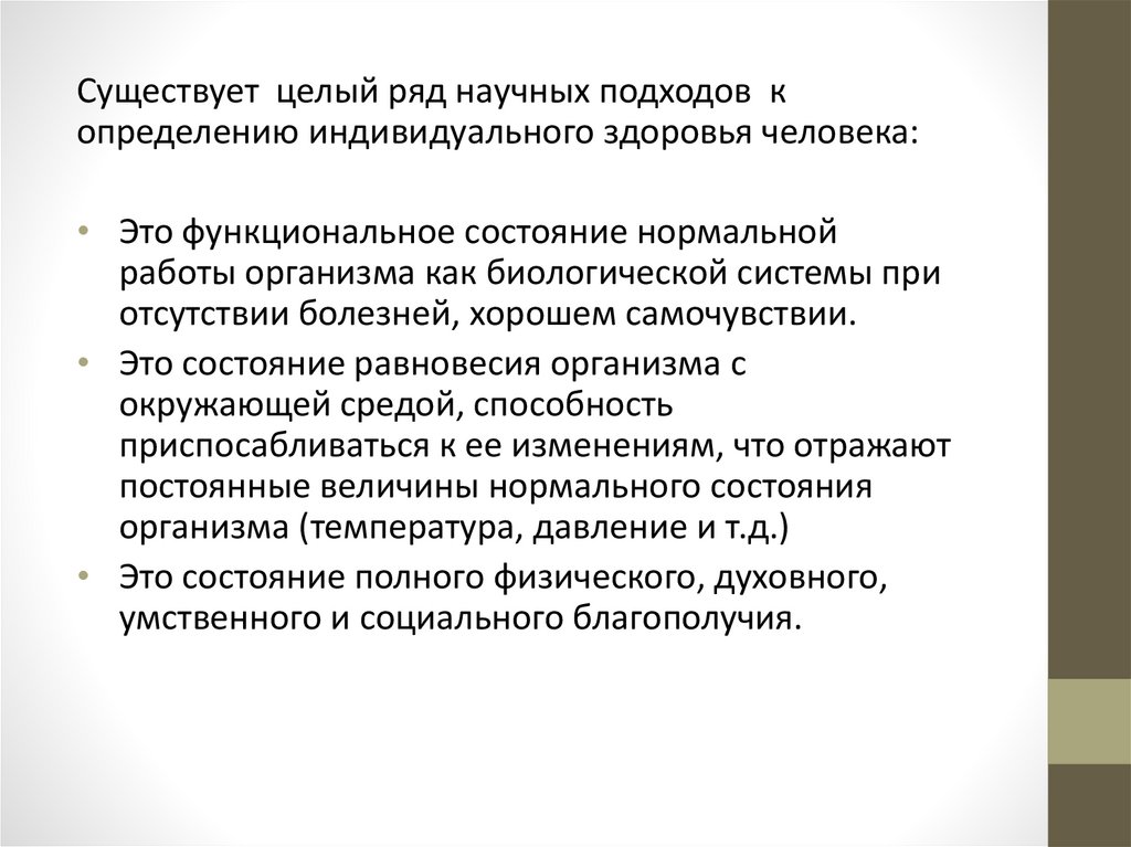 Существует целый ряд научных подходов копределению индивидуального здоровья человека: