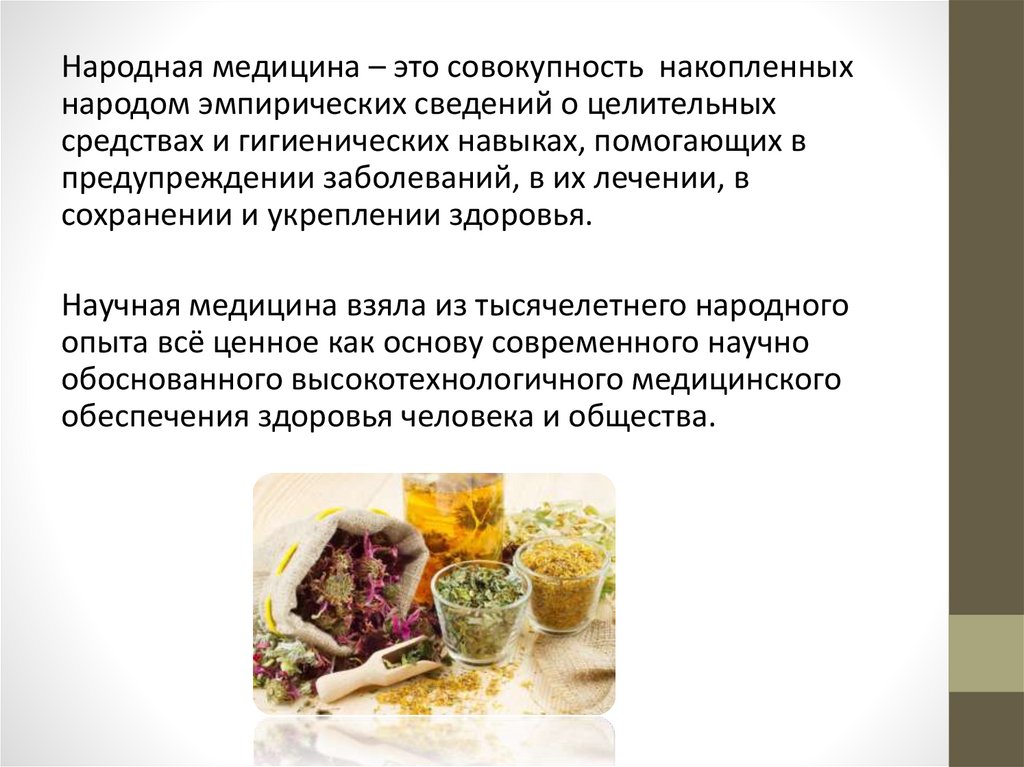 Народная медицина – это совокупность накопленныхнародом эмпирических сведений о целительных