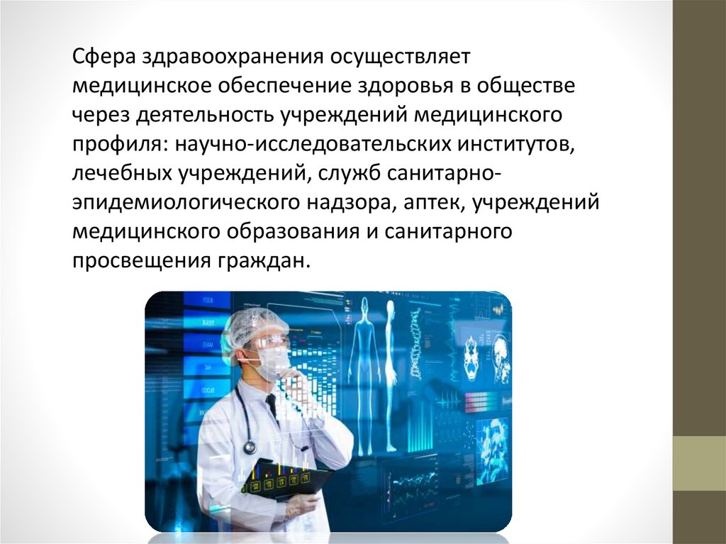Сфера здравоохранения осуществляетмедицинское обеспечение здоровья в обществе