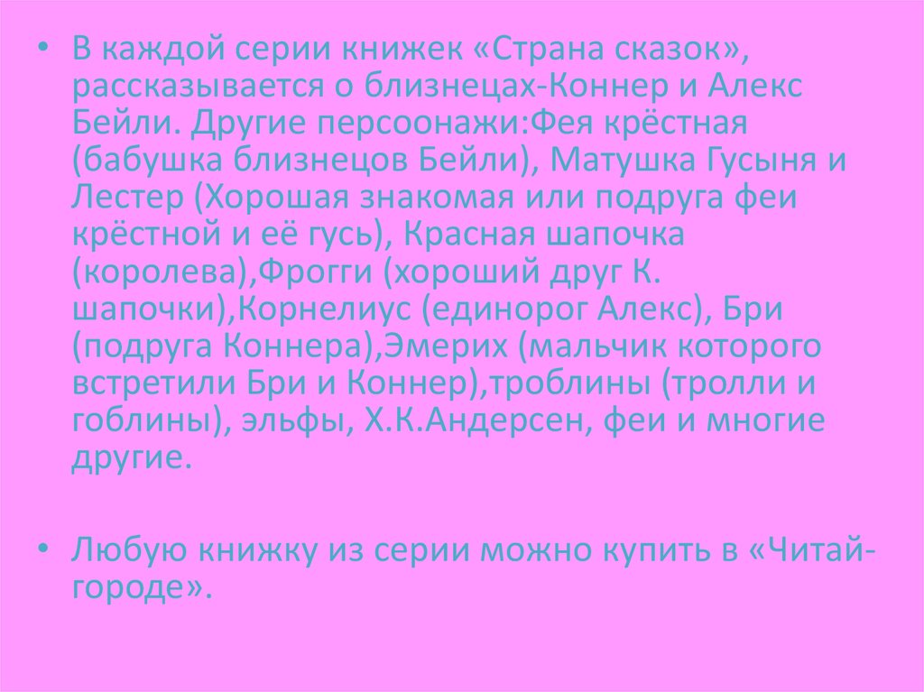 • В каждой серии книжек «Страна сказок»,рассказывается о близнецах-Коннер и Алекс