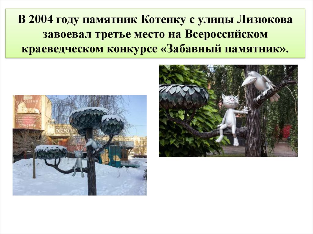 В 2004 году памятник Котенку с улицы Лизюковазавоевал третье место на Всероссийском
