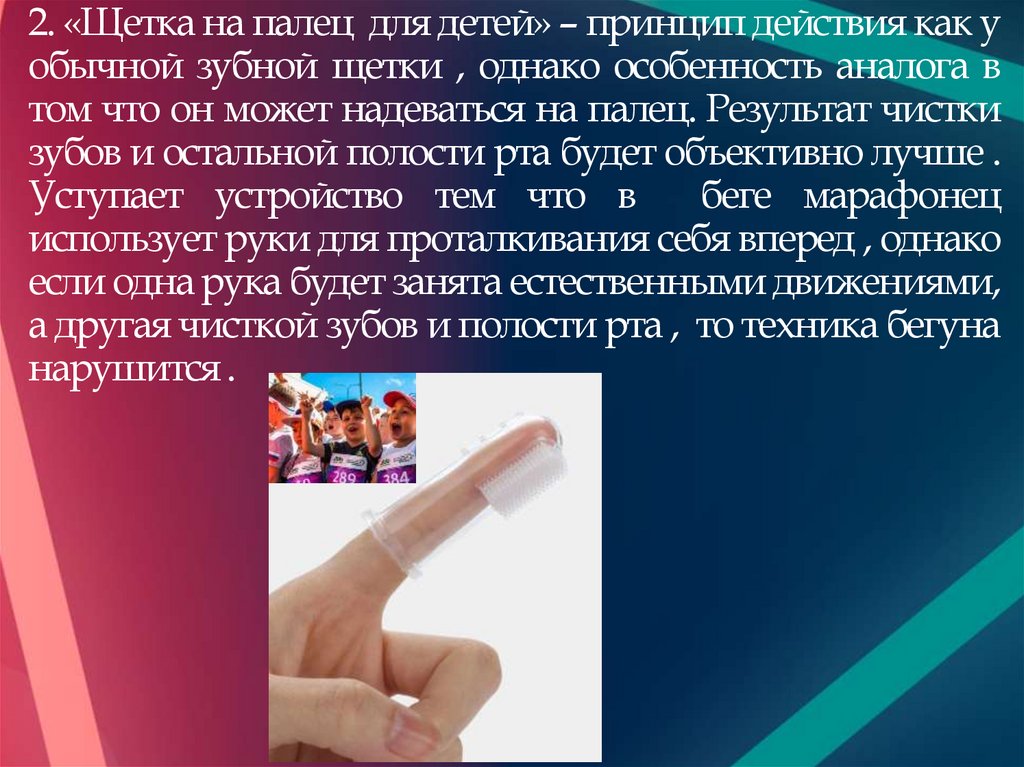 2. «Щетка на палец для детей» – принцип действия как уобычной зубной щетки , однако особенность аналога в