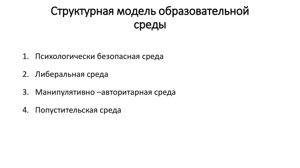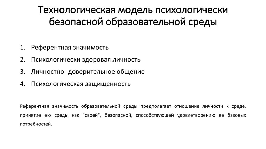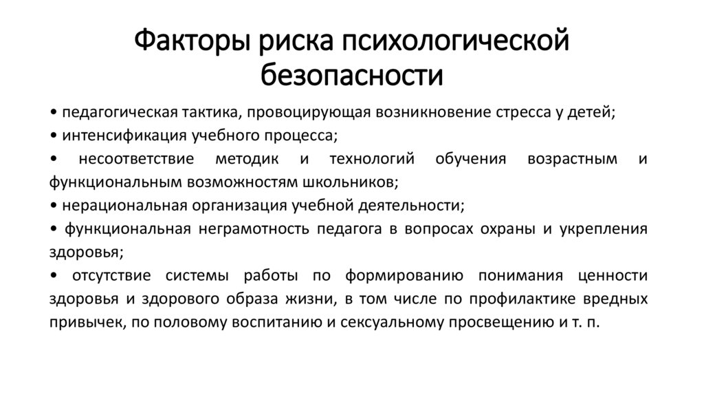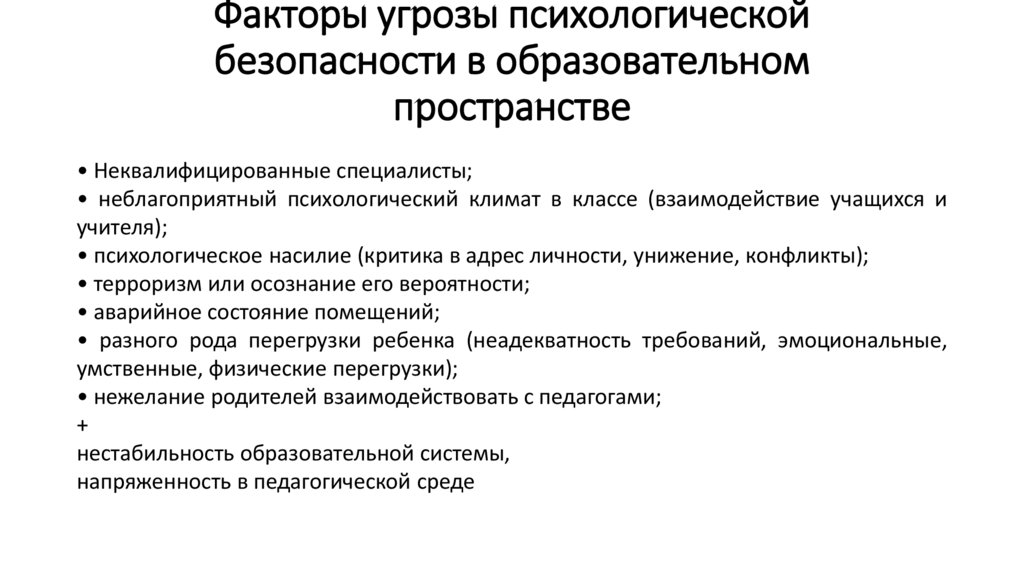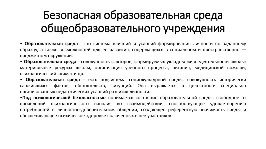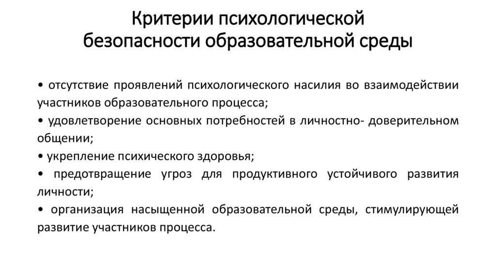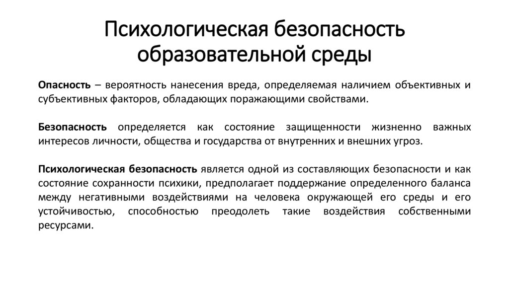 •Под психологической безопасностью понимается состояние образовательной среды, свободное от