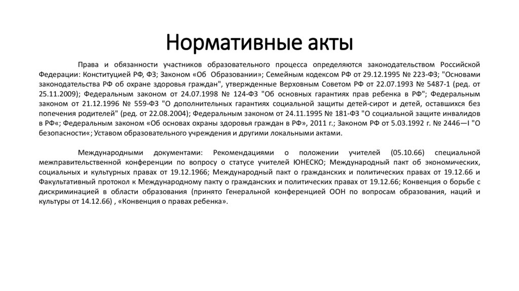 Федерации: Конституцией РФ, ФЗ; Законом «Об Образовании»; Семейным кодексом РФ от 29.12.1995 № 223-ФЗ; "Основами
