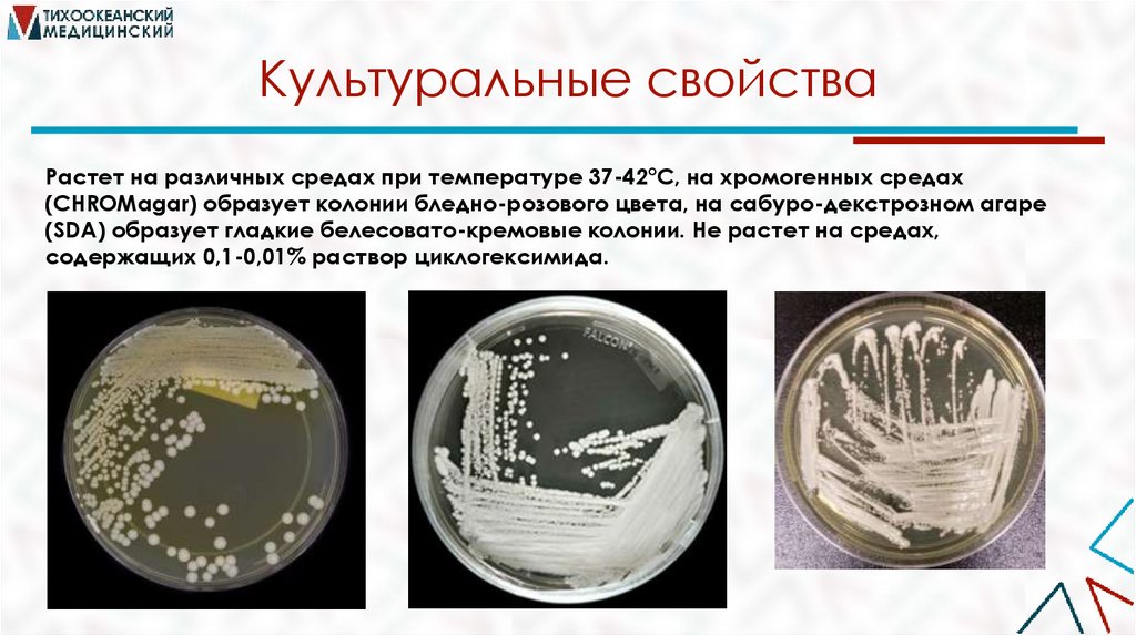 (CHROMagar) образует колонии бледно-розового цвета, на сабуро-декстрозном агаре