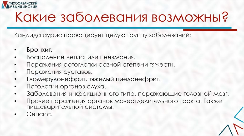 Какие заболевания возможны?Кандида аурис провоцирует целую группу заболеваний: