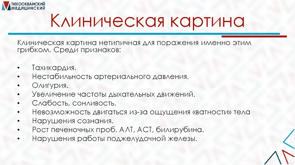 Клиническая картинаКлиническая картина нетипичная для поражения именно этим