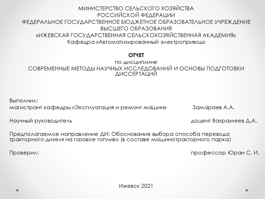 тракторного дизеля на газовое топливо (в составе машинотракторного парка)