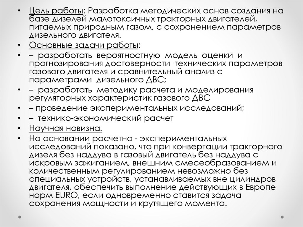 • Цель работы: Разработка методических основ создания набазе дизелей малотоксичных тракторных двигателей,