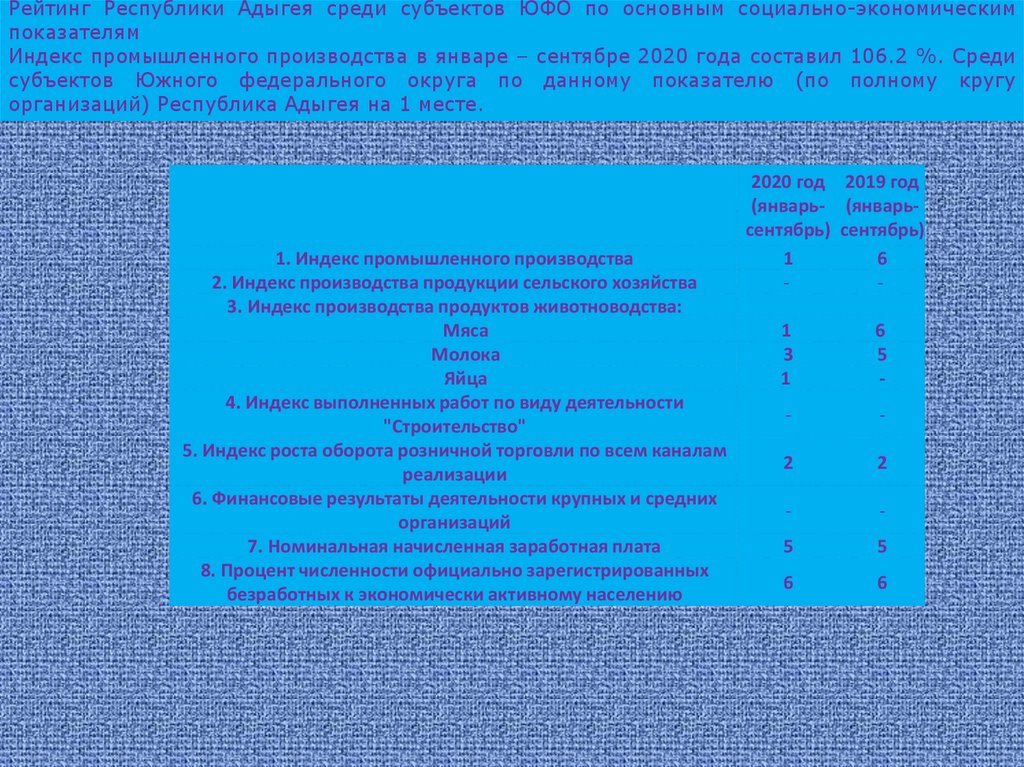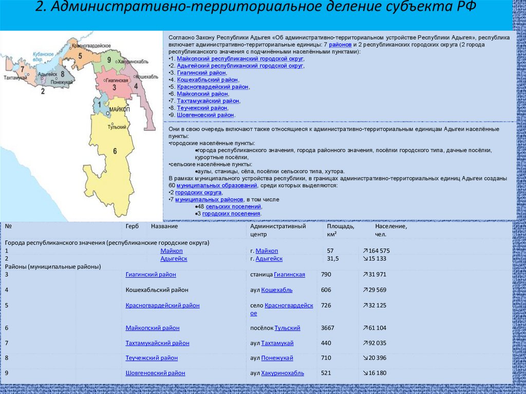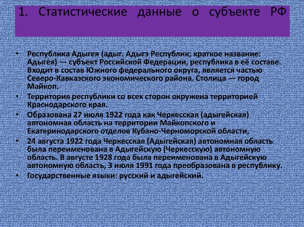 1. Статистические данные о субъекте РФ• Республика Адыгея (адыг. Адыгэ Республик; краткое название: