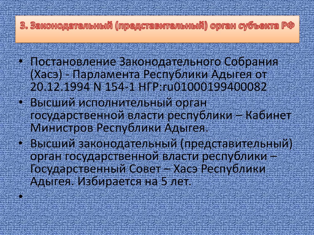 • 3. Законодательный (представительный) орган субъекта РФ.