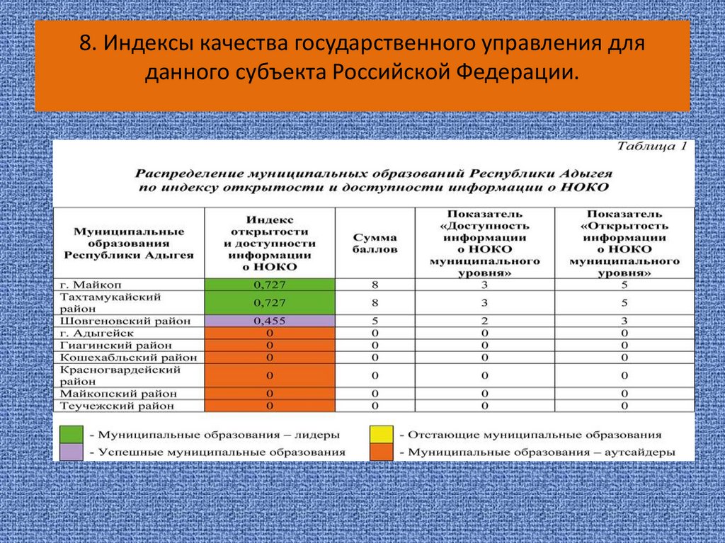 8. Индексы качества государственного управления дляданного субъекта Российской Федерации.