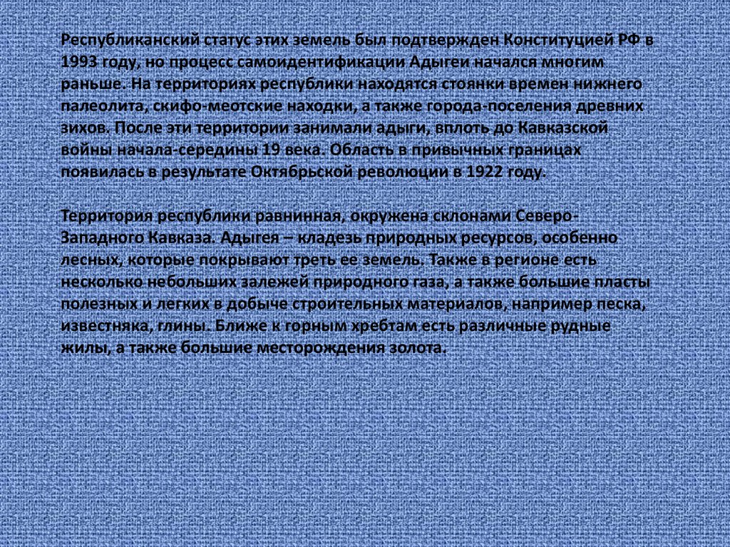 Республиканский статус этих земель был подтвержден Конституцией РФ в1993 году, но процесс самоидентификации Адыгеи начался многим