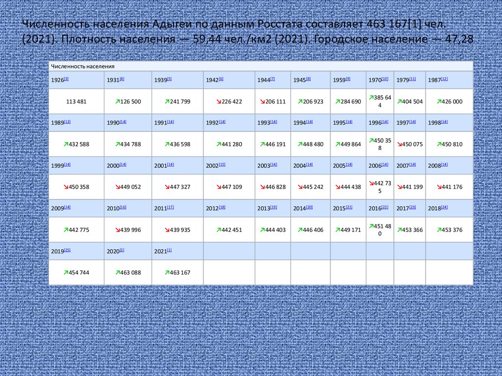 Численность населения Адыгеи по данным Росстата составляет 463 167[1] чел.(2021). Плотность населения — 59,44 чел./км2 (2021). Городское население — 47,28