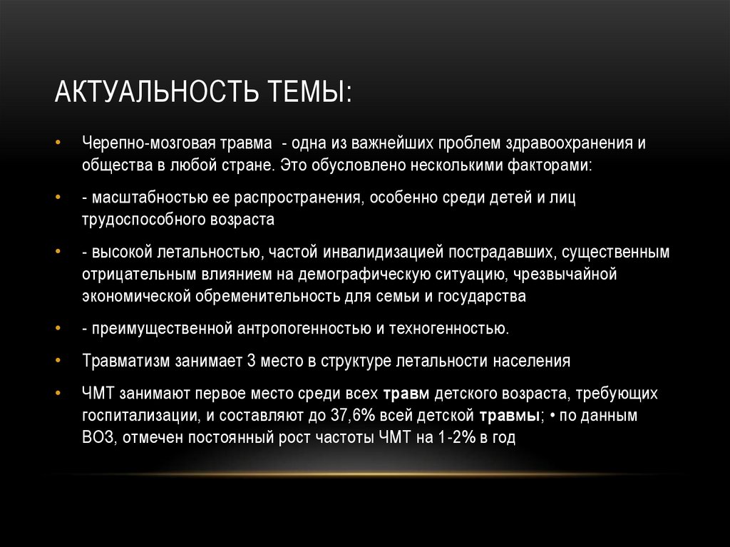 АКТУАЛЬНОСТЬ ТЕМЫ:Черепно-мозговая травма - одна из важнейших проблем здравоохранения и