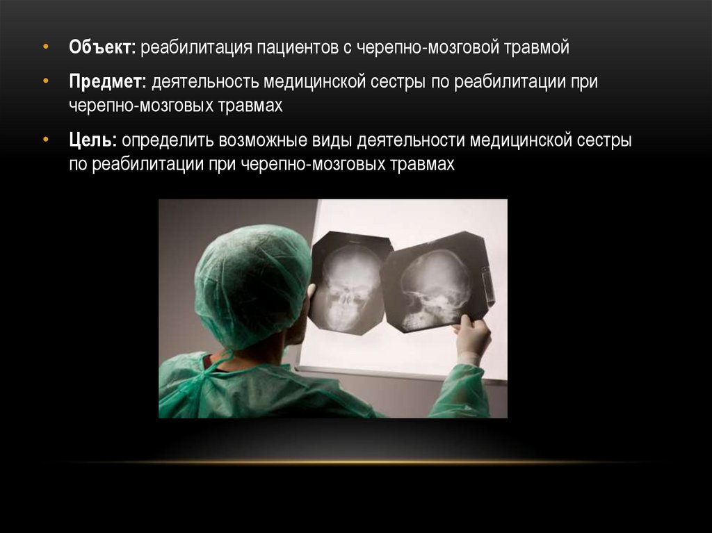 • Объект: реабилитация пациентов с черепно-мозговой травмой• Предмет: деятельность медицинской сестры по реабилитации при