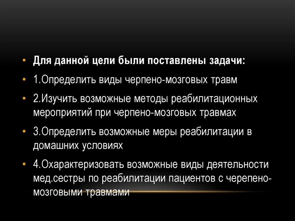 • Для данной цели были поставлены задачи:• 1.Определить виды черпено-мозговых травм