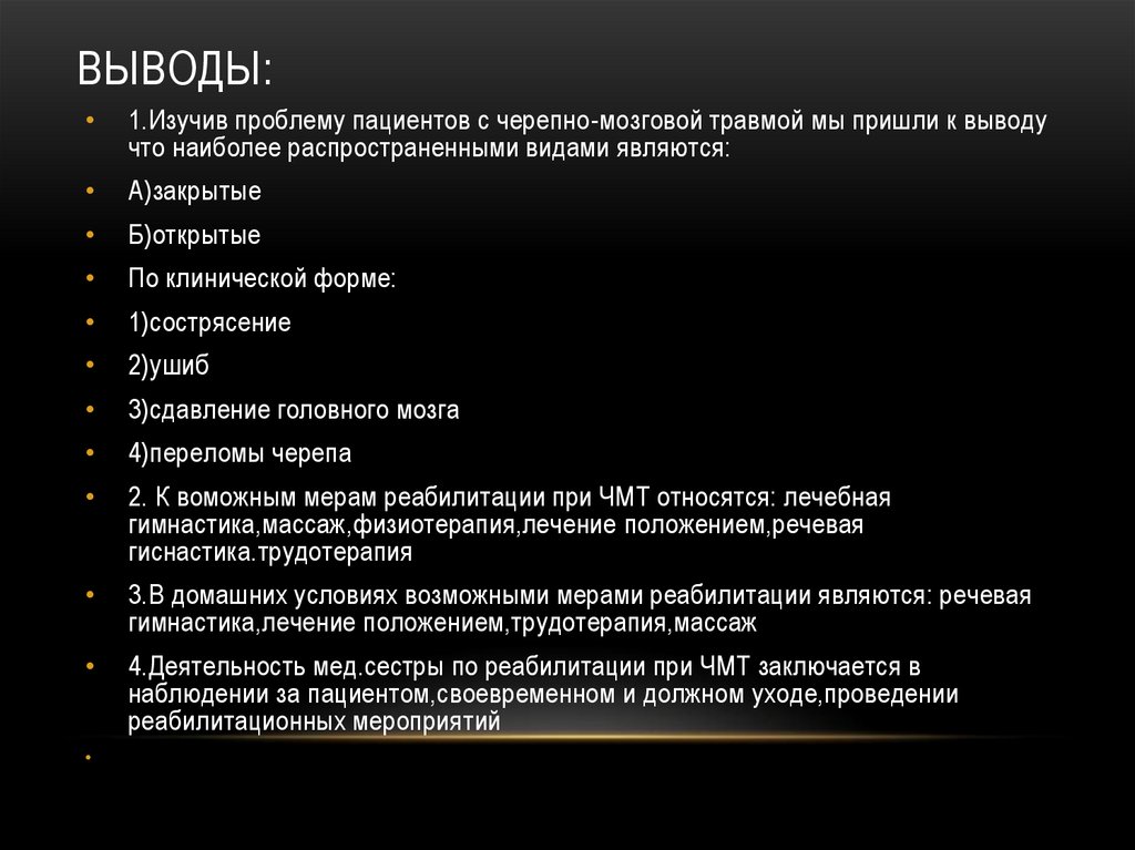 ВЫВОДЫ:1.Изучив проблему пациентов с черепно-мозговой травмой мы пришли к выводу