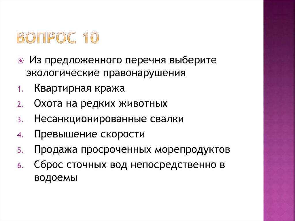 Из предложенного перечня выберитеэкологические правонарушения