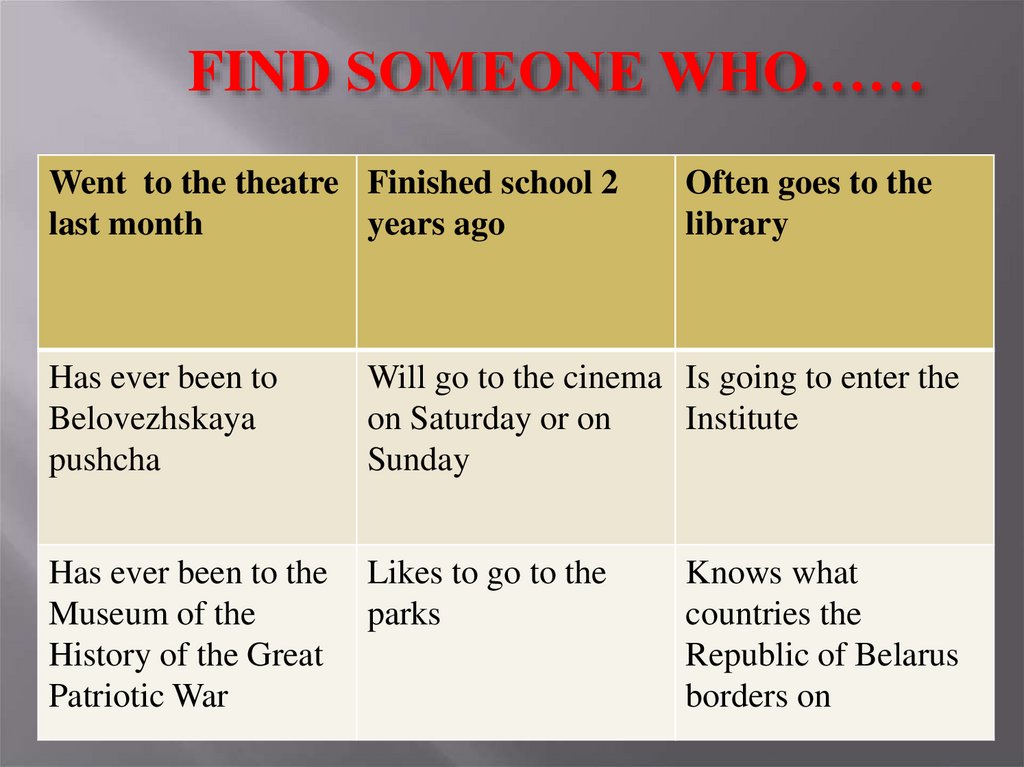 FIND SOMEONE WHO……Went to the theatre Finished school 2
