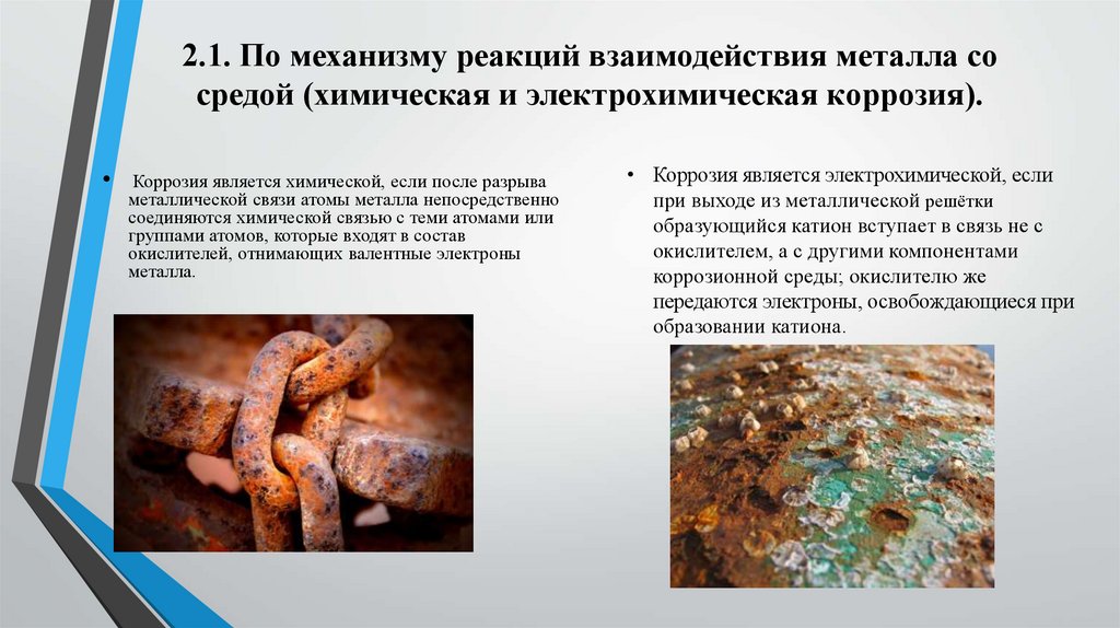 2.1. По механизму реакций взаимодействия металла сосредой (химическая и электрохимическая коррозия).