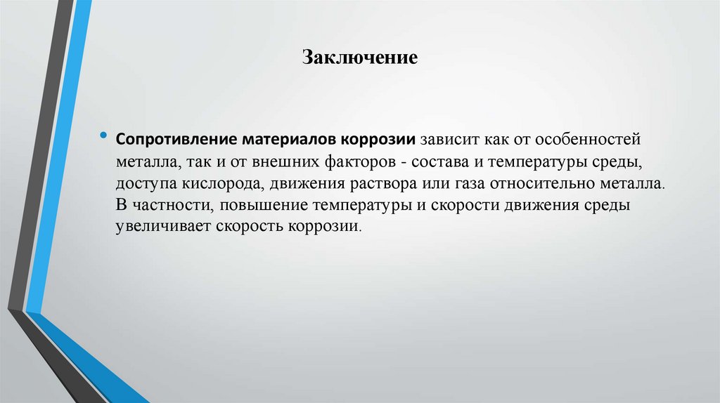 Заключение• Сопротивление материалов коррозии зависит как от особенностей