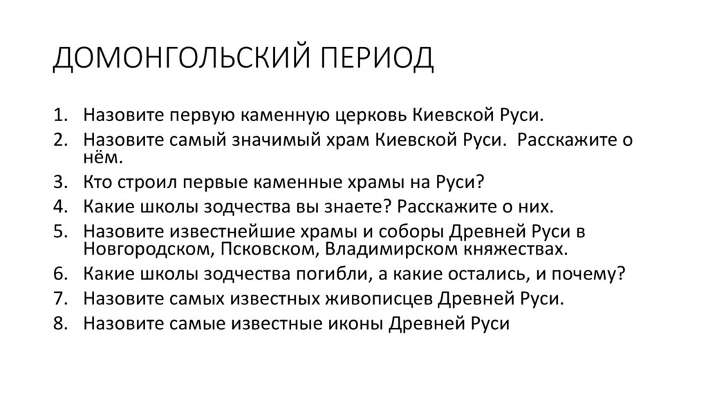 ДОМОНГОЛЬСКИЙ ПЕРИОД1. Назовите первую каменную церковь Киевской Руси.