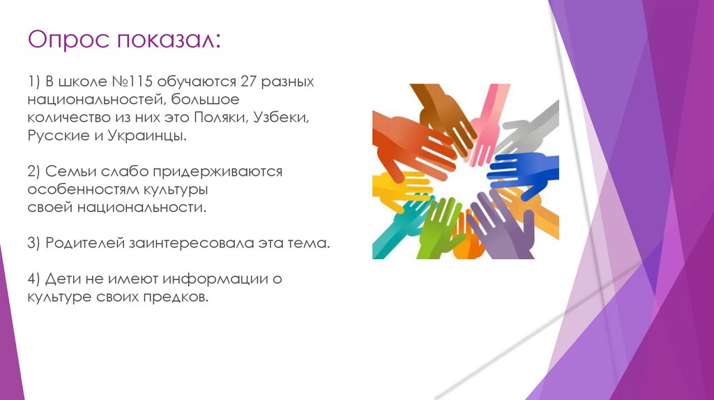 Опрос показал:1) В школе №115 обучаются 27 разных