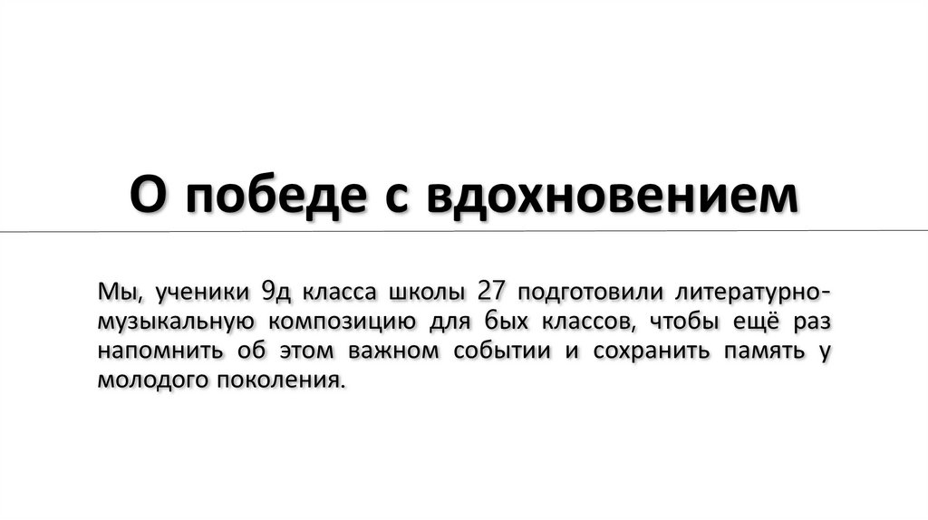 Мы, ученики 9д класса школы 27 подготовили литературномузыкальную композицию для 6ых классов, чтобы ещё раз