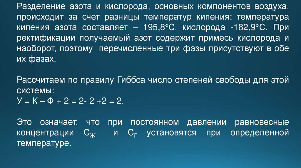 Разделение азота и кислорода, основных компонентов воздуха,происходит за счет разницы температур кипения: температура