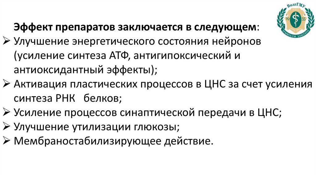 Эффект препаратов заключается в следующем:Улучшение энергетического состояния нейронов