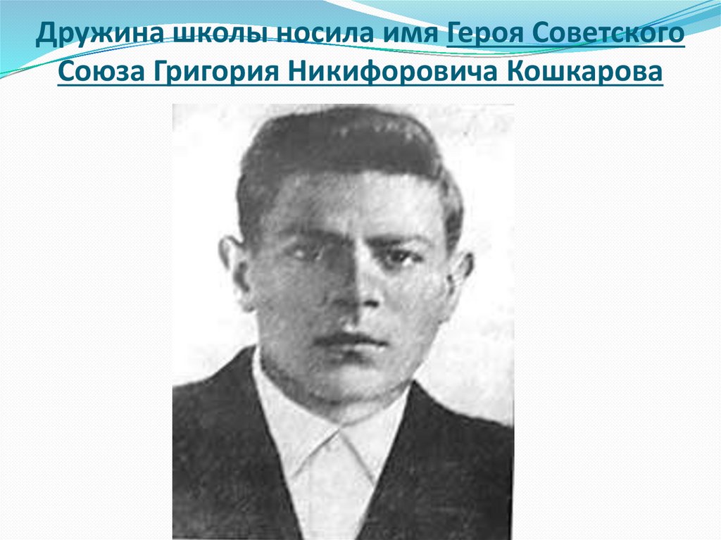 Дружина школы носила имя Героя СоветскогоСоюза Григория Никифоровича Кошкарова